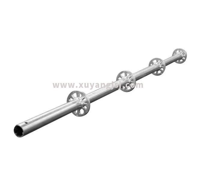 立桿:盤扣式腳手架的主要支撐部件,材質(zhì)一般采用Q355B,最長(zhǎng)可做成3M,國(guó)內(nèi)通常做成2M居多,壁厚3.25MM。直徑48和60MM的鋼管上每隔0.5M焊有可扣接8個(gè)方向接頭的圓形連接盤,立桿一端焊有立桿連接套筒或者內(nèi)部連接棒,用以垂直方向的立桿接高。立桿樣圖如下所示:
